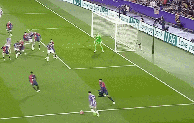 第69分钟,亚马尔一个美丽的脚后跟传球,福特在禁区里巧妙变向,一脚冷射击中立柱,球往外弹。到了第80分钟,赫拉德马丁头球甩到门前,亚马尔跟进推射,结果被对手惊险解围!临近比赛结束时,巴塞罗那连续赢得定位球,奥尔莫的两脚射门都是差之毫厘。最终,比赛结束,巴拉多利德可惜输给对手。